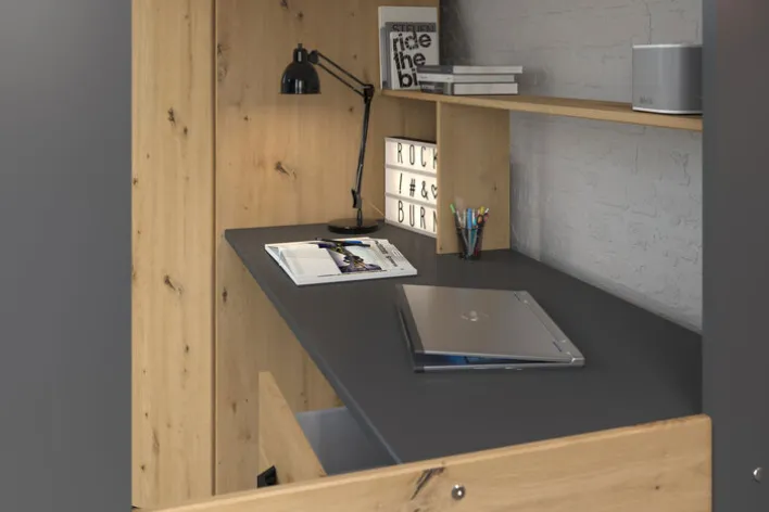 Perfekt für Jugendzimmer, Studentenbude, Kleinraumwohnung oder Tiny House! Das Hochbett HEAVY 1 bildet eine Wohneinheit für sich. Hier findet die Kleidung ihren Platz, am integrierten Schreibtisch sind Computer, Laptop und Schreibmaterial gut untergebracht. Kleiderstange und Ablagefächern im Schrank und die Ablage über dem Schreibtisch machen Ordnung halten leicht. Das Bett kann individuell mit einer Matratze ausgestattet werden. HEAVY 1 wird zerlegt geliefert, Montageanleitung und Pflegehinweise befinden sich am Artikel.