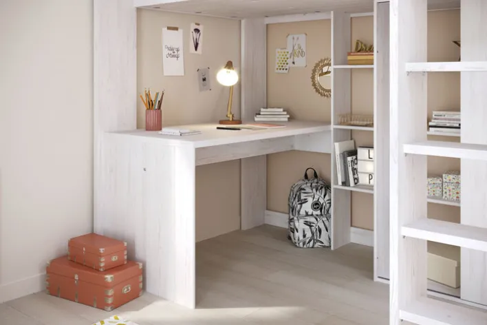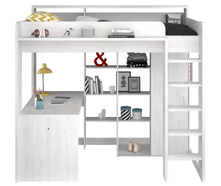 Trendig aus Holznachbildung in nordischer Eiche und nahezu ein Zimmer für sich: Unter dem Hochbett mit Leiter bieten ein Kleiderschrank, ein Schreibtisch und unterschiedliche Ablageflächen viel Stauraum. Für Ordnung und Übersicht sorgen zudem im Schrank eine Kleiderstange und Einlegeböden, die Ablagen vor dem Bett und im offenen Regal sind perfekt, um Gebrauchsgegenstände aufzubewahren und Deko stimmig zu arrangieren. Das Hochbett HIGHER 1 wird zerlegt geliefert, eine einfach verständliche Montageanleitung und Pflegehinweise gehören zum Lieferumfang.