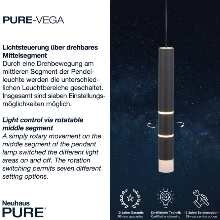 Das 3 kg schwere dreiflammige Paul Neuhaus LED Balkenpendel PURE-VEGA 120 cm schwarz ist 120 cm hoch bei einem Durchmesser von 5 cm. Die Hängeleuchte mit drehbarem Mittelelement besticht durch eine Besonderheit: Die eingebauten LED-Leuchtmittel lassen sich getrennt schalten und ermöglichen sieben unterschiedliche Lichtmodi für jede Stimmung.