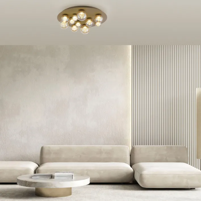Die LED Deckenlampe im Japandi-Stil kombiniert eine runde Form mit einer hochwertigen Verarbeitung aus Aluminium und Rauchglas. Die Oberfläche zeigt eine goldfarbige, leicht bronzefarbene Optik, die zusammen mit den elf rauchfarbenen Glaskugeln ein harmonisches, modernes Gesamtbild erzeugt. Die Glaskörper sind in unterschiedlichen Größen angeordnet und sorgen für ein interessantes Lichtspiel sowie eine sanfte Lichtverteilung. Die Konstruktion wirkt solide und eignet sich durch ihre dezente Farbgestaltung für verschiedene Wohnbereiche, darunter Wohnzimmer, Schlafzimmer, Küche, Flur und Arbeitszimmer.