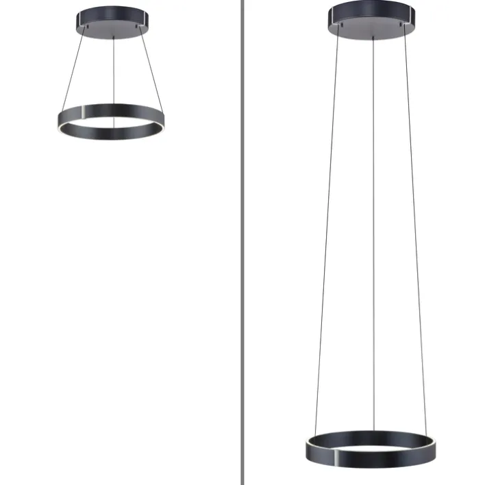 Die graue LED-Pendelleuchte PURE E-CLIPSE mit einem Durchmesser von 50 cm beeindruckt mit ihrer technischen Ausstattung: So lassen sich mit der mitgelieferten Fernbedienung die Höhe und die Farbtemperatur dieser Leuchte aus Metall verstellen.