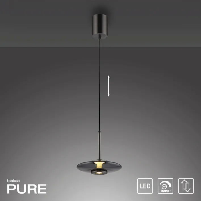 Die LED-Pendelleuchte PURE VITRUM 22 cm setzt sich aus grauem Metall und einem rauchfarbenen Lampenschirm aus Glas zusammen – eine elegante Lösung für vielfältige Innenräume! Funktional beeindruckt die Leuchte der Premiummarke Paul Neuhaus ebenfalls.