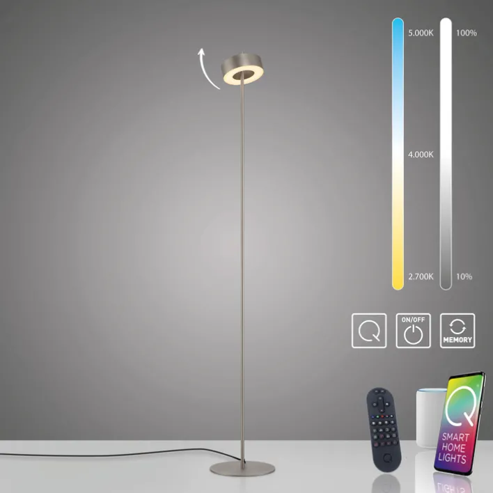 Entdecken Sie die vielseitige LED Stehlampe von Paul Neuhaus, die Funktionalität und modernes Design vereint. Mit einer Höhe von 140 cm und einem Durchmesser von 22 cm fügt sich diese Lampe nahtlos in jeden Raum ein. Die Alu-/Nickelfarbige Oberfläche verleiht ihr einen zeitlosen Look, während das robuste Metallmaterial für Langlebigkeit sorgt. Diese Stehlampe ist mit einer fest eingebauten LED ausgestattet, die eine Lichtleistung von 850 Lumen bei einem Energieverbrauch von nur 9 Watt bietet. Die Farbtemperatur ist von 2.700 bis 5.000 Kelvin einstellbar, sodass Sie die Lichtstimmung nach Ihren Wünschen anpassen können. Dank der ZigBee-Fähigkeit lässt sich die Lampe in Smart Home integrieren und bequem per Fernbedienung steuern. Die praktische Memory-Funktion speichert bevorzugte Einstellungen, während der Schnurschalter eine einfache Bedienung ermöglicht.