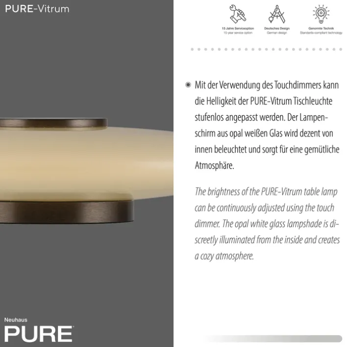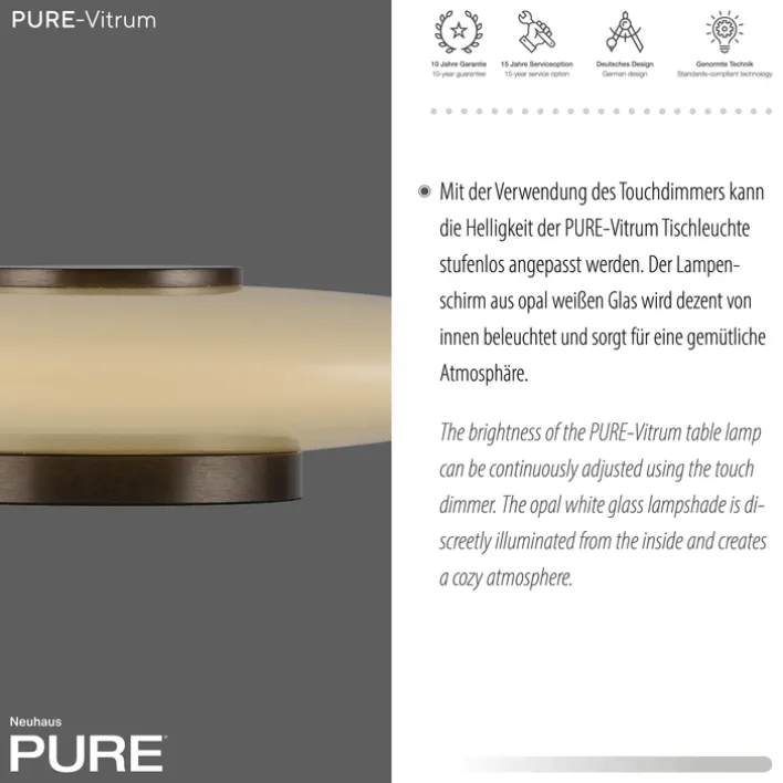 Die braunfarbige LED Tischlampe PURE VITRUM hat einen Durchmesser von 32 cm. Sie ist aus Metall und Glas gefertigt sowie mit einem praktischen Touchdimmer ausgestattet.
