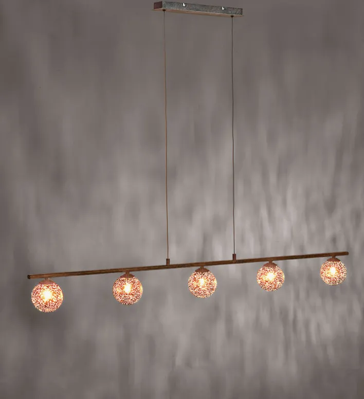 Die Paul Neuhaus Retrofit Pendellampe GRETA sorgt mit einem rostfarbigen Pendel, an dem fünf goldfarbige Kugeln befestigt sind, auf 132 cm für eine schöne Ausleuchtung des Esstisches. Mit ihrem filigranen Muster zaubern die Kugeln zudem wunderschöne Lichteffekte an Wand, Decke und Tisch. Zudem kann die Pendellampe in der Höhe verstellt werden. Für den Betrieb der CE-geprüften Pendelleuchte werden fünf Leuchtmittel mit G9 Fassung benötigt. Verwenden lassen sich 40 Watt Retrofit Glühbirnen ebenso, wie 8 Watt LED Leuchtmittel.