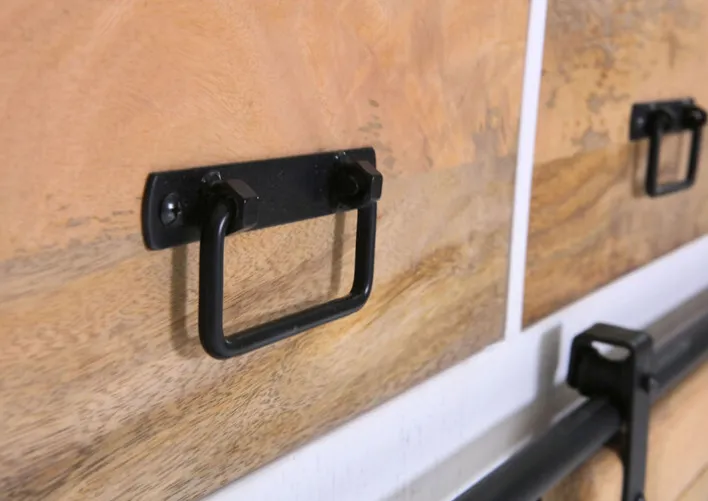Farbe: BraunWeißSchwarzFarbton: Rahmen: Mango massiv sägerau, weiß lackiert/Abdeckplatte, Schiebetüren & Schubladenfronten: Mango massiv natur, gebeizt und lackiert; Metallaplikationen: schwarz lackiert/Inneneinteilung, Seitenpaneele und Rückwand: MDF, weiß lackiertHauptfarbe: Braun