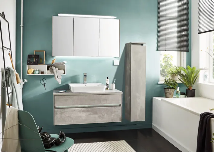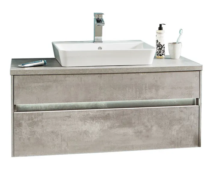 Der mit LEDs beleuchtete Waschplatz UNIQUE mit einer Breite von 102 cm ist die perfekte Einrichtungslösung für moderne Badezimmer, Duschen oder Gäste-WCs. Durch seine geschmackvoll gestalteten Oberflächen in hoch glänzendem Polarweiß und Fronten Betonoptik ist der Waschplatz ein Blickfang, der vielseitig kombinierbar ist. Das rechteckige Waschbecken aus hochwertig verarbeiteter Keramik fällt sofort ins Auge. Der Unterschrank bietet mit seiner Oberplatte und seinen zwei leicht laufenden Schubkästen viel Platz und Stauraum für Handtücher, Hygiene- und Kosmetikartikel.