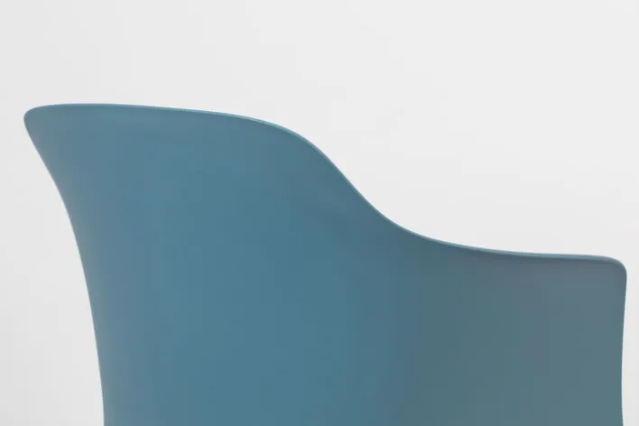 Der Armlehnstuhl aus der Serie ARMTANGO präsentiert sich in einem einheitlichen, matten Blauton. Die Sitzschale und die fest integrierten Armlehnen bestehen aus Polypropylen, einem robusten Kunststoff. Das Kufengestell aus pulverbeschichtetem Stahl sorgt für Stabilität und unterstreicht das moderne, schlichte Design des Stuhls. Die Gesamtmaße betragen 58 cm in der Breite, 54 cm in der Tiefe und 81,5 cm in der Höhe. Die Sitzhöhe liegt bei 45,5 cm, Sitzbreite und Sitztiefe jeweils bei 45 cm, während die Armlehnen eine Höhe von 69,5 cm aufweisen. Die Oberfläche wirkt glatt und pflegeleicht, ohne sichtbare Muster oder Texturen. Die maximale Belastbarkeit beträgt 150 kg, was einen vielseitigen Einsatz im Esszimmer ermöglicht. Die klaren Linien und die durchgängige Farbgestaltung unterstreichen den zeitgemäßen Charakter dieses Möbelstücks.
