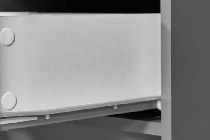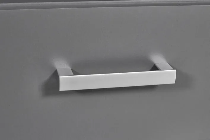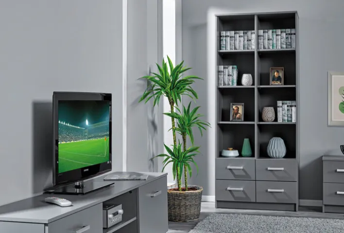 Das Regal ROBERT besteht aus einer grauen Holznachbildung. Es verfügt über 4 Schubkästen und 6 Einlegeböden. Seine Breite beträgt 81,5 cm, die Höhe liegt bei 191,2 cm und die Tiefe bei 40 cm.