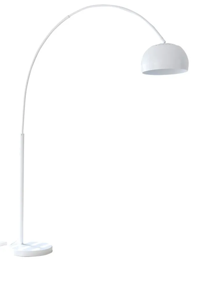 Die Retrofit Bogenlampe kombiniert weißes Metall mit Marmor in Weiß. Mit ihrem modernen und doch minimalistischen Look lässt sie sich vielseitig kombinieren, während der große Lampenschirm eine angenehme, blendfreie Beleuchtung ermöglicht.