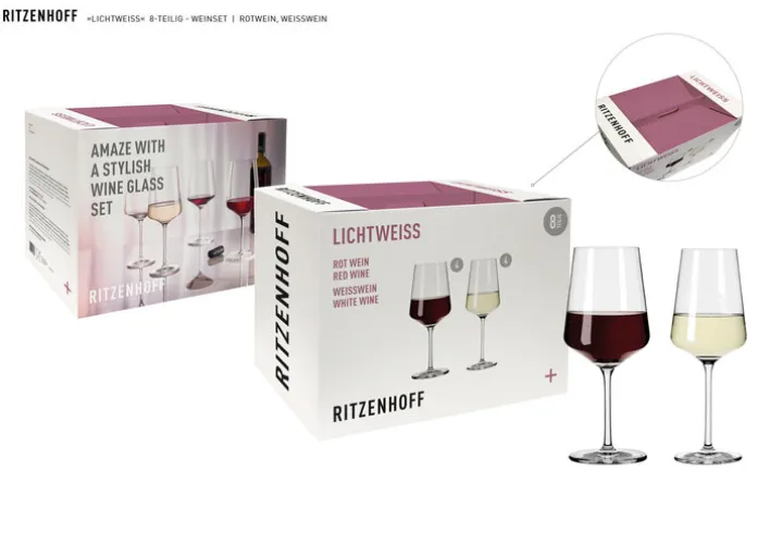 Das edle RITZENHOFF Rot- und Weißweingläser-Set LICHTWEISS besteht aus einem 8-teiligen Set. Im Lieferumfang enthalten sind vier 540 ml fassende Rotweingläser und vier Weißweingläser mit einem Fassungsvermögen von je 400 ml.