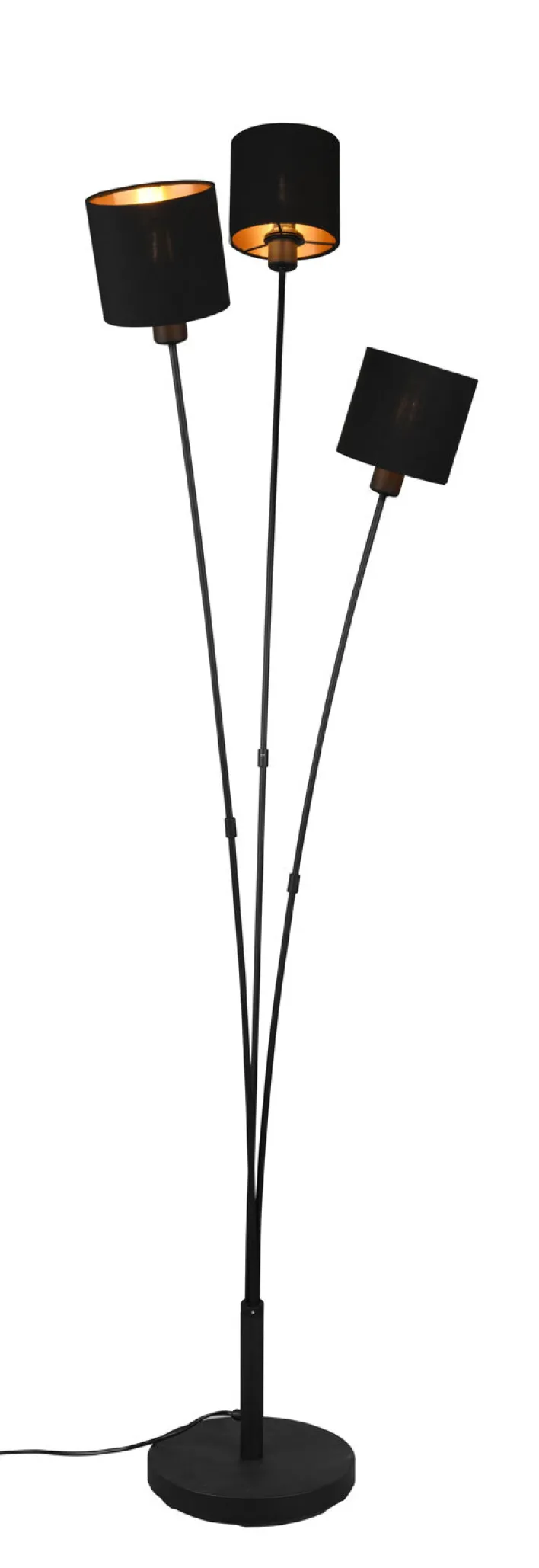 Modernes Design und wohnlich warmes Licht bietet die 150 cm hohe RL Retrofit Stehlampe TOMMY mit ihren drei unterschiedlich ausgerichteten Spots. Die außen schwarz und innen goldfarbig gehaltenen Metallschirme zaubern ein gemütliches Ambiente in Wohn- oder Schlafräume. Für die komfortable Bedienung ist die Leuchte mit einem Fußschalter ausgestattet.