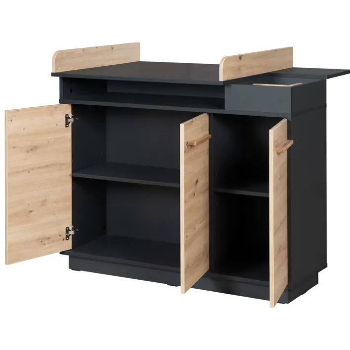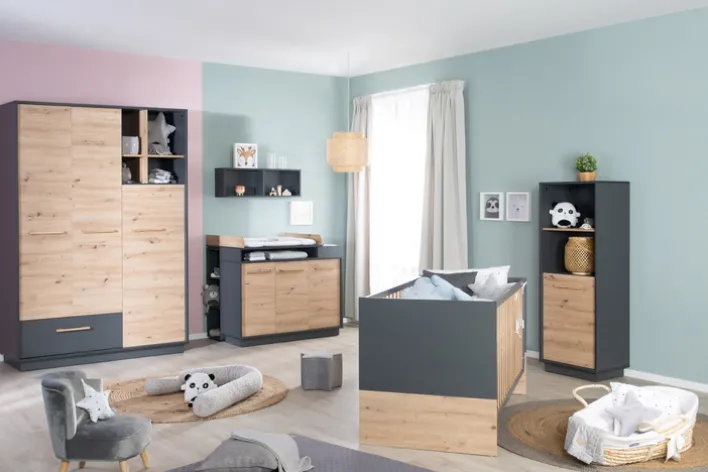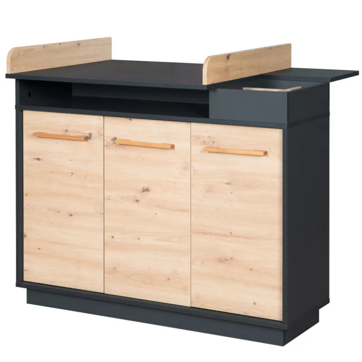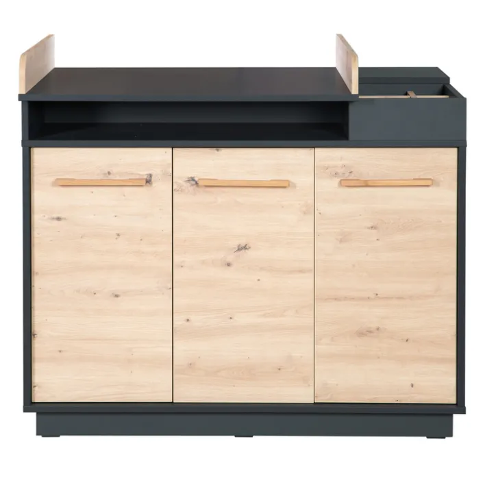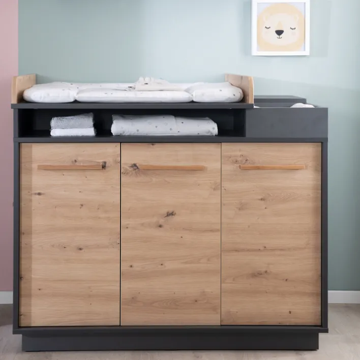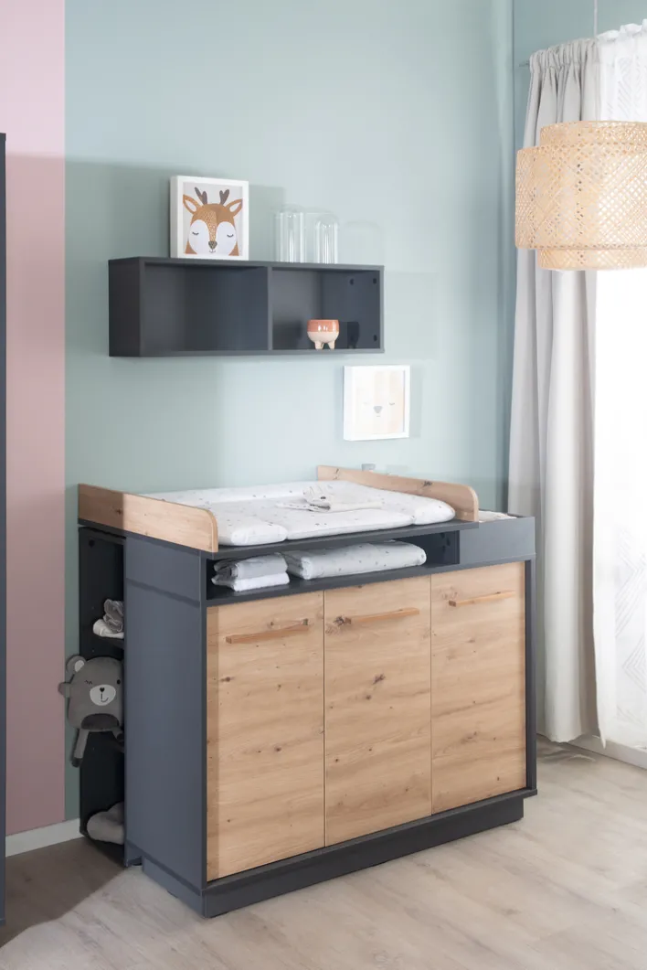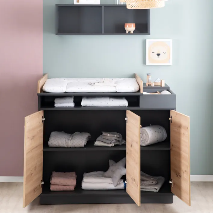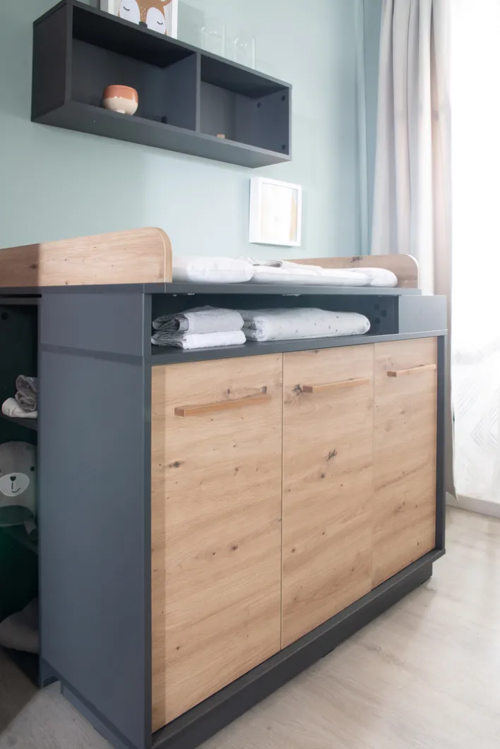 Die Wickelkommode verfügt über drei Falttüren, hinter denen sich zwei Einlegeböden befinden, sowie ein offenes Fach, das zusätzlichen Stauraum bietet. Die klaren Linien und die natürliche Holzoptik machen sie zu einem stilvollen Möbelstück, das sich harmonisch in jedes Kinderzimmer einfügt. Die Kombination aus braunen und grauen Farbtönen unterstreicht das moderne Design und sorgt für eine warme Atmosphäre.
