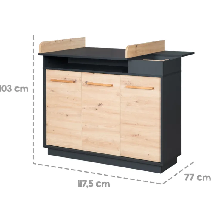Die Wickelkommode der Serie LENN von Roba – Baumann vereint Funktionalität und modernes Design. Mit einer Breite von 118 cm, einer Höhe von 103 cm und einer Länge von 77 cm bietet sie ausreichend Platz für alle Wickelutensilien. Die Kommode besteht aus einer hochwertigen Holznachbildung in Artisan Eiche und Anthrazit, was ihr ein elegantes und zeitloses Aussehen verleiht. Die mitteldichte Faserplatte (MDF) sorgt für Stabilität und Langlebigkeit.