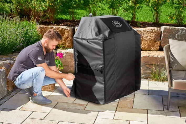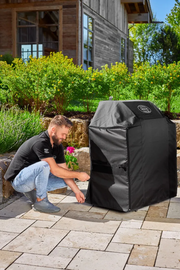 Die UV-beständige Schutzhülle VIDERO von RÖSLE ist 116 cm breit, 85 cm hoch und hat eine Tiefe von 52 cm. Dank Reißverschluss sowie Laschen zum Abziehen und Aufhängen lässt sie sich leicht verwenden. Sie ist größenverstellbar und kann daher für ab- und aufgeklappte Seitentische gleichermaßen verwendet werden. Die RÖSLE Schutzhülle VIDERO hat durch die Schnallen zum Fixieren am Grill jederzeit einen festen Sitz. Praktisch sind auch die Netzeinsätze, die für eine optimale Luftzirkulation unter der Abdeckung sorgen.