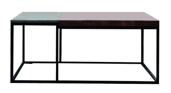 Das stabile Gestell des Couchtisches 985 ist aus schwarz lackiertem Stahl mit kantigem Profil gefertigt. Die auffällige Tischplatte vereint zwei völlig unterschiedliche natürliche Materialien, die dennoch perfekt zusammen harmonieren. Massives Holz vom Nussbaum, bei dem die Holzmaserung schön ausgeprägt ist, strahlt Wärme aus. Es steht im Gegensatz zur kühlen Wirkung des grauen Sandsteins mit imprägnierter Oberfläche.
