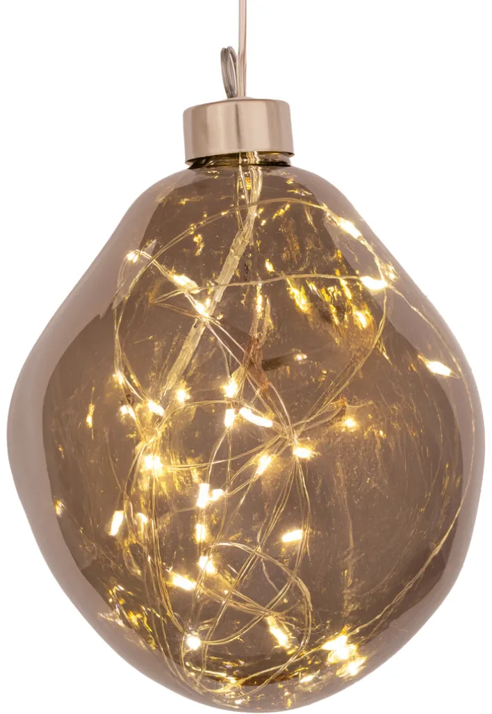 Der Deko Anhänger aus der Serie NUGGET4 besteht aus Glas und ist für den Innenbereich geeignet. Mit einer Länge, Breite und Tiefe von jeweils 10 cm präsentiert sich das Objekt in einer kompakten, kugelförmigen Form. Die Oberfläche zeigt eine graue, leicht spiegelnde Glasstruktur, die mehrfarbig reflektiert. Im Inneren des Anhängers befindet sich eine integrierte, feine Lichterkette, deren warmweiße Lichtpunkte für einen dezenten Lichteffekt sorgen und das Glasobjekt von innen heraus beleuchten. Das Design ist modern und zurückhaltend, wodurch sich der Anhänger vielseitig in unterschiedliche Wohnbereiche integrieren lässt.