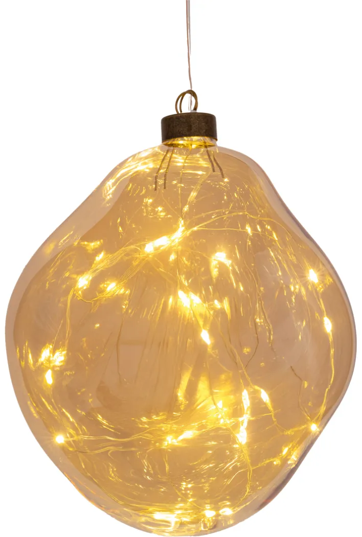 Der Deko Anhänger aus der Serie NUGGET6 besteht aus Glas und ist für den Innenbereich geeignet. Das Produkt misst 15 cm in Tiefe, Breite und Durchmesser. Die Oberfläche zeigt eine mehrfarbige, vorwiegend amber-goldene Farbgebung mit goldfarbenen Akzenten. Die Form ist rundlich und leicht unregelmäßig, was dem Anhänger eine organische Anmutung verleiht. Im Inneren befinden sich feine Lichterketten, die ein warmes, stimmungsvolles Licht erzeugen und für eine dekorative Beleuchtung sorgen. Der Anhänger wird an einer Aufhängung befestigt und eignet sich besonders zur saisonalen oder festlichen Gestaltung von Wohnräumen.