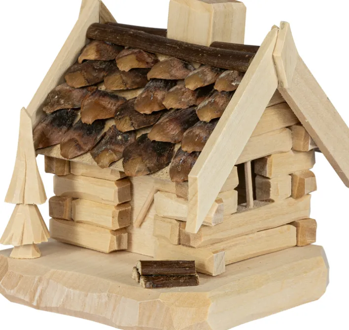 Dieses Deko-Objekt aus der Serie RÄUCHERHÜTTE besteht vollständig aus Holz und zeichnet sich durch eine detailreiche Verarbeitung aus. Die kleine Hütte ist in natürlichen Holztönen gehalten und steht auf einer rechteckigen, leicht abgeschrägten Bodenplatte. Das Dach ist mit naturbelassenen Holzschindeln gedeckt, die eine rustikale Optik erzeugen. Ein angedeuteter Schornstein sowie ein stilisierter Baum und ein Holzscheit ergänzen das Gesamtbild. Die Blockbauweise der Wände ist klar zu erkennen und betont die traditionelle Ausführung. Mit einer Tiefe von 9 cm, einer Breite von 8,5 cm und einer Höhe von 9,5 cm eignet sich das Objekt ideal als dekoratives Element für den Innenbereich. Das Gewicht beträgt 0,8 kg.