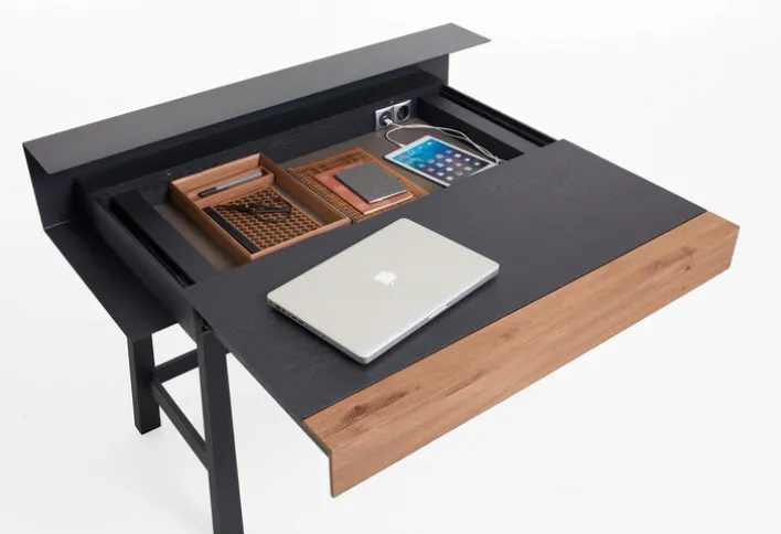 Der Sekretär YORIS hat eine Größe von 60 x 87 x 120 cm und vereint sein Vierfußgestell grauem Metall mit einer grauen Tischplatte aus Kerneiche mit anthrazitfarbiger Metallblende. Unter der verschiebbaren Tischplatte gibt der Schreibtisch jede Menge Stauraum frei. Das versteckte Fach mit integrierter Steckdose mit USB-Ladebuchse ist perfekt um Arbeitsunterlagen zu verstauen, während die erhöhte Metallblende Platz zum Abstellen von Schreibutensilien oder Dekorationen bietet.