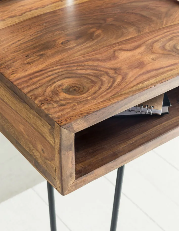 Der ausgefallene Schreibtisch verfügt über eine 110 x 60 cm große Tischplatte aus massivem Sheesham-Holz mit gebeizter Oberfläche. Für einen ästhetischen Kontrast sorgt das schwarze Vierfußgestell aus pulverbeschichtetem Eisen in matter Ausführung.