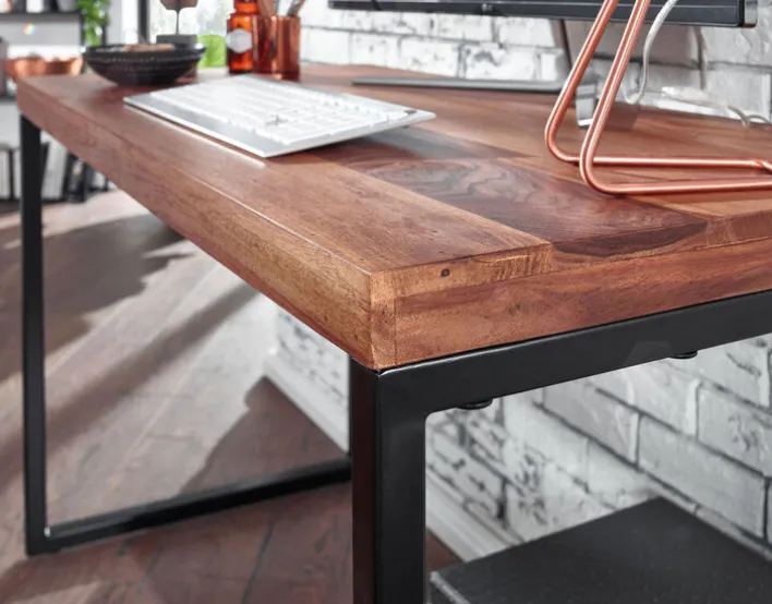 Für Desktop-Setups mit Tastatur, Maus, Tischlampe und bis zu zwei Monitoren ist der Schreibtisch von gut geeignet. Er ist bis 50 kg belastbar. Die Platte ist aus Massivholz gefertigt. Es handelt sich um widerstandsfähiges Sheesham. Die Oberflächen sind gebeizt und lackiert. Das U-Gestell ist aus Metall hergestellt und matt in Schwarz pulverbeschichtet. Tischplatte und rechteckige Basis sind innerhalb weniger Minuten miteinander verschraubt. Fertig zusammengebaut, wiegt der Schreibtisch 19 kg.