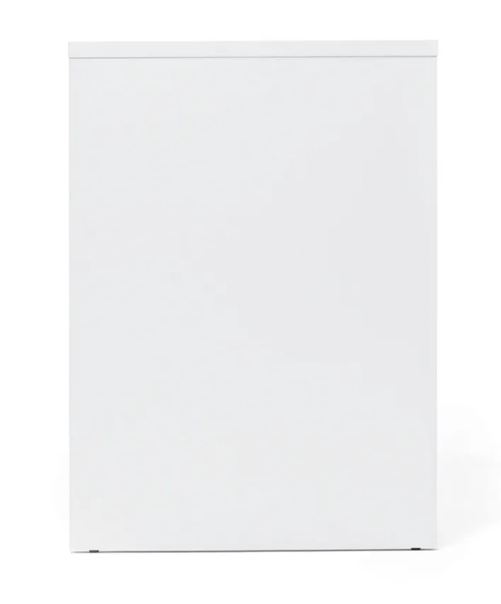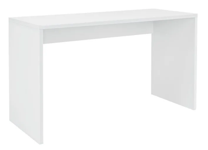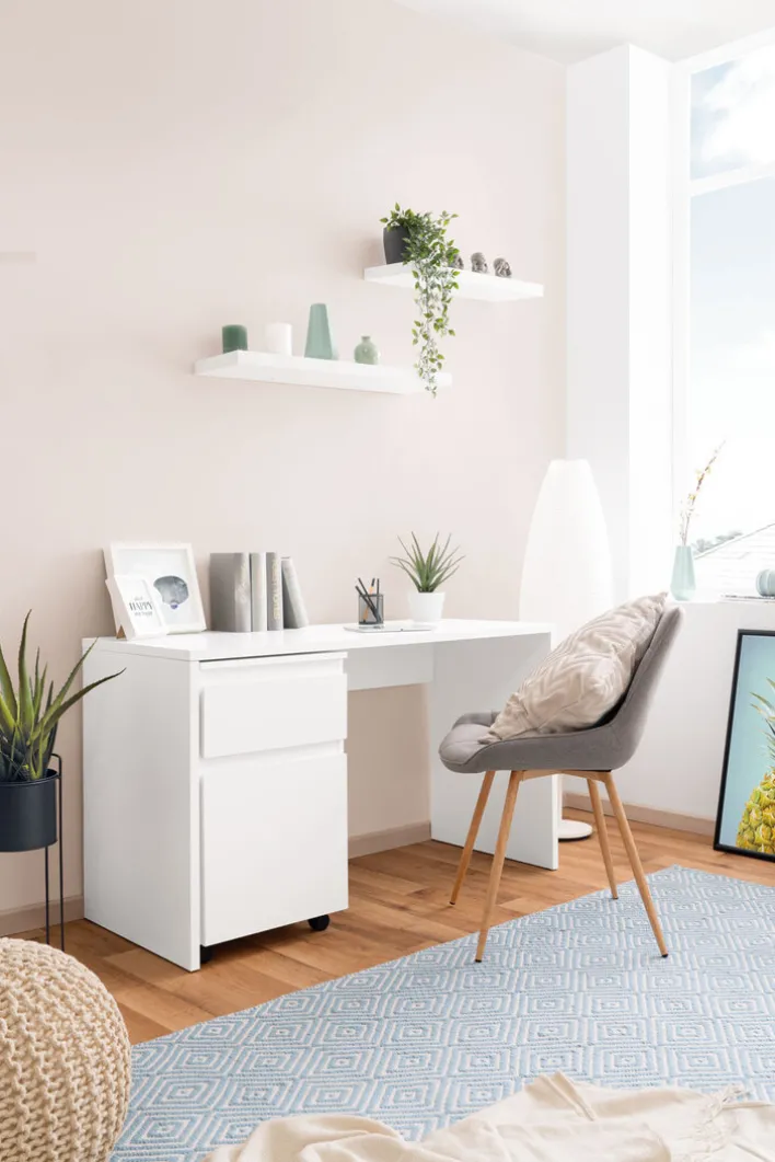 Der 75 cm hohe, weiße Schreibtisch ist 130 cm breit und 54 cm tief. Er beeindruckt mit solider Sachlichkeit und guter Qualität.