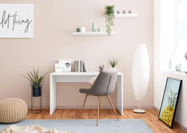Dieser preisgünstige Schreibtisch von porta.de ist aus der Holznachbildung MDF (Mitteldichte Faserplatte) gefertigt. Die matte, weiße Arbeitsplatte hat als Unterbau ein stabiles Kufengestell. Mit seinen Maßen bietet dieser einfache Schreibtisch viel Beinfreiheit, eine große Arbeitsfläche, Platz für Laptop und Drucker. Darunter lässt sich problemlos ein Rollcontainer stellen, für zusätzlichen Stauraum bei genug Beinfreiheit. Hinten unter der Arbeitsplatte verläuft quer eine Stabilisierung, die zusätzlich für gute Standfestigkeit sorgt. Insgesamt ein sehr praktischer, moderner Schreibtisch, einsetzbar im gesamten Wohnbereich.