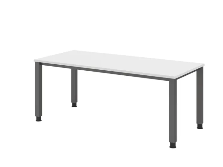 Mit seiner Farbgebung in Weiß und Graphit wirkt der Schreibtisch trotz seiner Größe von 180 x 83,5 x 80 cm leicht und filigran. Der Schreibtisch ruht auf vier Füßen aus Stahl in silberner Farbe, welche dem Tisch eine enorme Belastbarkeit verleihen. Die Füße sind zudem höhenverstellbar, sodass sich der Schreibtisch an jeden Einsatzort und -Zweck problemlos anpassen lässt.