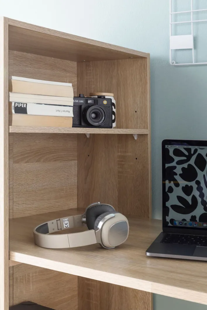 Der Schreibtisch mit Regal besteht aus folierter Holznachbildung und hat eine Größe von 120 x 120 x 53 cm. Seine Oberflächen sind strapazierfähig und lässt sich einfach abwischen. Die Schreibtischoberfläche ist mit einem Gewicht von maximal 20 kg belastbar und somit auch für Monitore bestens geeignet. In den sechs offenen Fächern bietet der Schreibtisch jede Menge Stauraum. Mit seiner natürlichen Holzfarbe verleiht der Schreibtisch dem Büro eine gemütliche Atmosphäre.