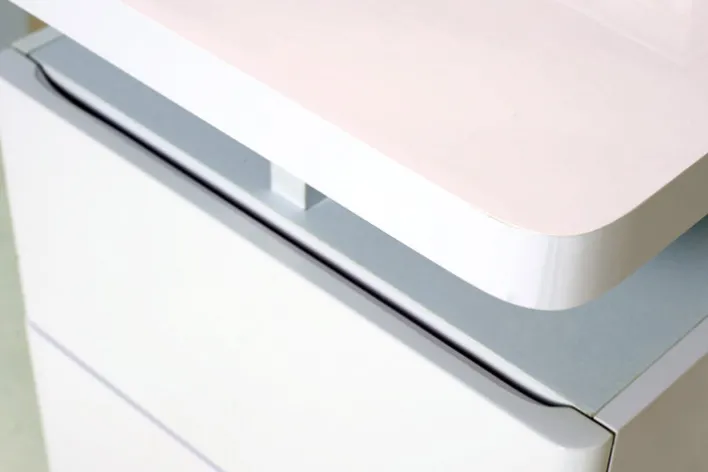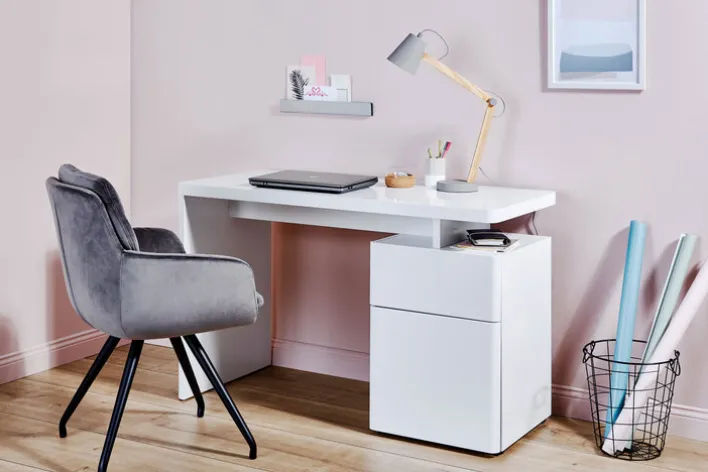 Die dicke Oberplatte des Schreibtisches, das Grundgestell, sowie der Korpus sind optisch ansprechend mit Holzfurnier in der Variante Weiß Hochglanz gestaltet. Eine praktische