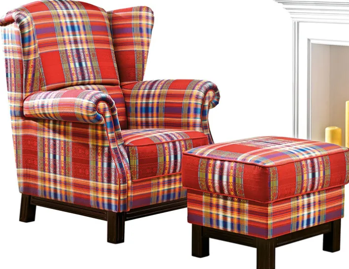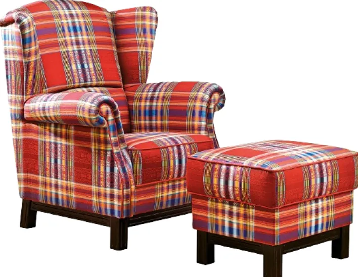 Das aus Sitzmöbel und Hocker bestehende SESSEL-SET verfügt über ein solides Holzgestell, welches seine Oberflächen im unteren Bereich maronfarbig präsentiert. Exzellente Polster sind im oberen Möbelbereich in rot-kariertem Stoff mit Keder gestaltet. Modern und vom nostalgischen Original abweichend zeigt sich der feste Sessel-Sitz, welcher mit Superbonellfederkern ausgestattet ist. Der Sitz wird von charakteristisch geschwungenen Armlehnen und einer mit den typischen Ohren versehenen Rückenlehne eingerahmt. Entspannen Sie nach einem arbeitsreichen Tag nachhaltig auf dem Sessel und lassen Sie Ihre müden Beine auf dem Hocker zur Ruhe kommen.