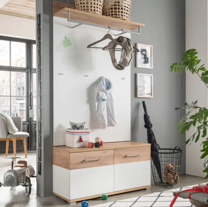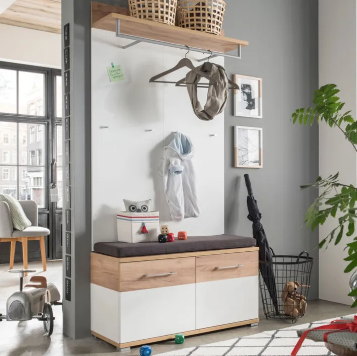 Der auf silberfarbenen Füßen aus Kunststoff ruhende Schuhschrank besticht durch seine freundliche Farbkombination. Sein Korpus ist im oberen Bereich in Navarra Eiche Nachbildung ausgeführt, im unteren Bereich überwiegt pflegeleichtes Weiß. ABS-Kanten und die Beschichtung mit Melaminharz gestaltet das Möbelstück robust und langlebig. An der Vorderseite verschließen zwei Türen mit Türdämpfung Räume mit jeweils einem verstellbaren Einlegeboden. Insgesamt kann das Interieur bis zu acht Paar Schuhe aufnehmen. Unser Shop bietet Ihnen auch ein passendes Sitzkissen zum Wechseln der Schuhe an.