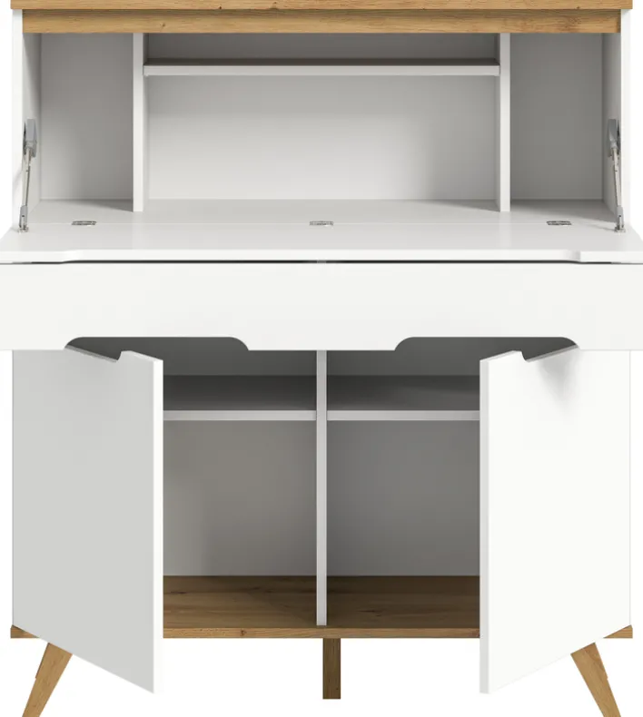 Der Sekretär verfügt über zwei Schubkästen und drei Einlegeböden, die vielseitige Aufbewahrungsmöglichkeiten bieten. Das Material aus Holznachbildung in matter Optik sorgt für eine pflegeleichte Oberfläche und eine ansprechende Haptik. Die Kombination aus Weiß und Nox Oak verleiht dem Möbelstück eine warme und einladende Ausstrahlung, die sich harmonisch in verschiedene Wohnstile einfügt. Die stabilen, leicht ausgestellten Beine aus Eiche runden das Design ab und sorgen für einen sicheren Stand.