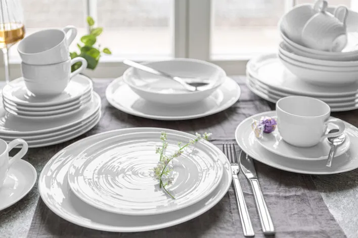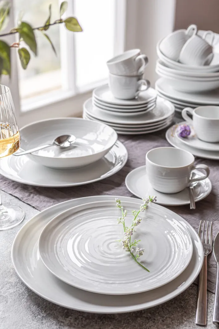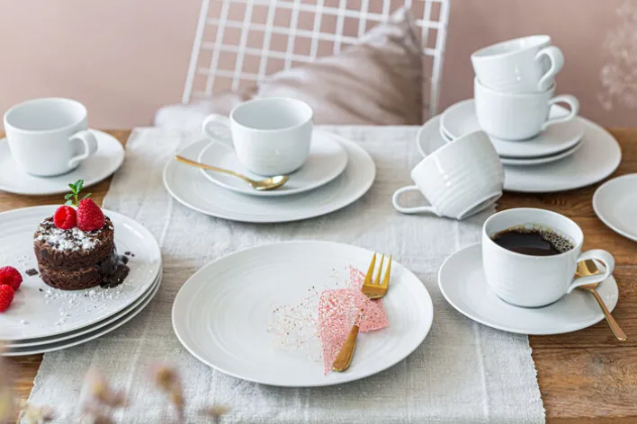 Wer sich nach einem neuen Kaffeeservice umsehen oder erstmalig für Küche und Esszimmer ausstatten möchte, kann sich für das 18-teilige Modell TERRA in Weiß aus dem Hause Seltmann Weiden entscheiden. Es präsentiert sich in einem schlichten, puristisch-minimalistischen Look – seine geriffelte Optik sorgt für einen kleinen und sehr dezenten Kontrast.