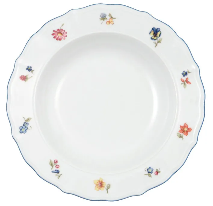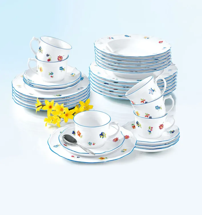 Mit dem zwölf teiligen Tafelservice SONATE NOSTALGIE in Weiß mit nostalgischen Streublumen Dekor laden Sie zu einem Abendessen im Landhaus Stil ein. Vervollständigen können Sie Ihr neues Tafelservice SONATE NOSTALGIE durch ein Kaffeeservice oder Schüsseln, Schalen, Servierplatten und vieles mehr. Im Lieferumfang enthalten sind je sechs Speiseteller und Suppenteller. Das farbenfrohe Streublumendekor auf dem weißen Porzellan bei der Serie SONATE NOSTALGIE zeugt von moderner Landhaus Romantik. Mit der sommerlichen Frische von Streublumen und dem zarten, blauen Rand verzaubert die Porzellan Serie SONATE NOSTALGIE Sie und Ihre Gäste auf ganz besondere Weise. Dekorativ und alltagstauglich, das ist die Geschirr Serie SONATE NOSTALGIE, die Bereicherung für Ihr Zuhause. Eine Vielzahl an passenden Geschirrteilen der Serie SONATE NOSTALGIE finden Sie in Ihrem Online Shop.
