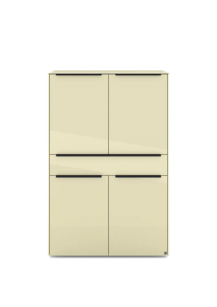 Das Highboard der Serie RENO präsentiert sich in einem modernen Design und bietet eine elegante Lösung für Ihr Zuhause. Mit einer Breite von 92 cm, einer Höhe von 140 cm und einer Tiefe von 42 cm fügt es sich nahtlos in verschiedene Wohnräume ein. Die Hauptfarbe Beige, kombiniert mit einem Kaschmir matt und Kaschmir Lack Finish, verleiht dem Möbelstück eine zeitlose Eleganz. Die Oberfläche ist lackiert und bietet eine ansprechende Hochglanzoptik, die durch die klaren Linien und die schlichte Form unterstrichen wird.