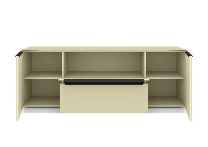 Ausgestattet mit zwei Drehtüren, einem Schubkasten und zwei Einlegeböden, bietet das Lowboard vielseitige Aufbewahrungsmöglichkeiten. Eine zusätzliche Klappe sorgt für weiteren Stauraum. Die gedämpften Scharniere und die lackierte Oberfläche aus Holznachbildung und Glas unterstreichen die hochwertige Verarbeitung. Die schwarzen Griffe setzen einen stilvollen Kontrast und runden das Gesamtbild harmonisch ab.
