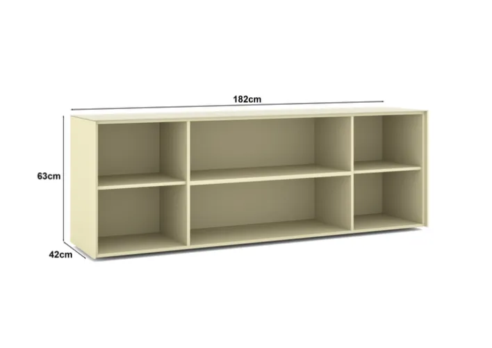 Das Lowboard der Serie RENO präsentiert sich in einem modernen Design, das durch seine klare Linienführung und die elegante Hochglanzoptik besticht. Mit einer Breite von 182 cm, einer Höhe von 63 cm und einer Tiefe von 42 cm bietet es großzügigen Stauraum. Die Hauptfarbe Beige, kombiniert mit einem Kaschmir matt / Kaschmir Lack Finish, verleiht dem Möbelstück eine zeitlose Eleganz, die sich nahtlos in verschiedene Wohnstile einfügt.