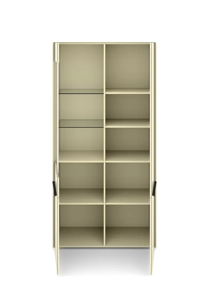 Die Vitrine verfügt über zwei Drehtüren und ist mit gedämpften Scharnieren ausgestattet, die ein sanftes Schließen ermöglichen. Die Griffe sind inklusive und sorgen für eine einfache Handhabung. Die lackierte Oberfläche in Hochglanzoptik unterstreicht das stilvolle Erscheinungsbild. Die Vitrine ist ideal für alle, die Wert auf Qualität und modernes Design legen.
