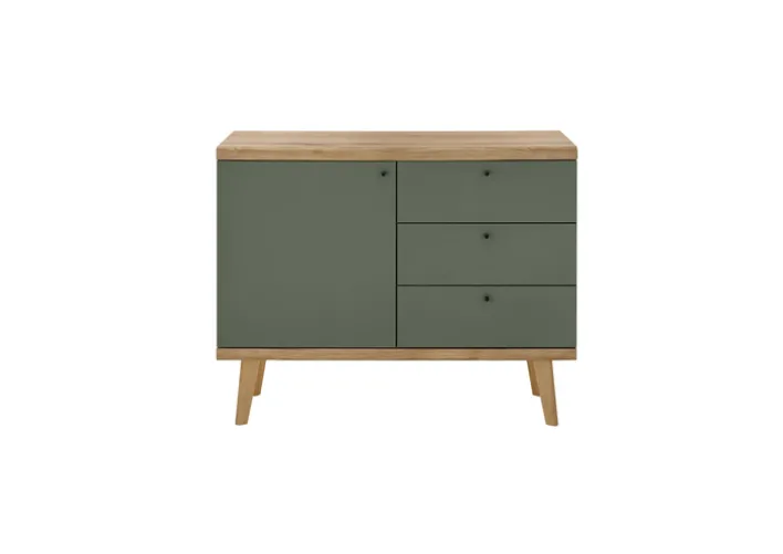 Das Sideboard ALVA mit der schönen Farbkombination salbeifarbig-braun misst 107 x 83. Es stellt eine optisch ansprechende Ablage- und Aufbewahrungsmöglichkeit dar.