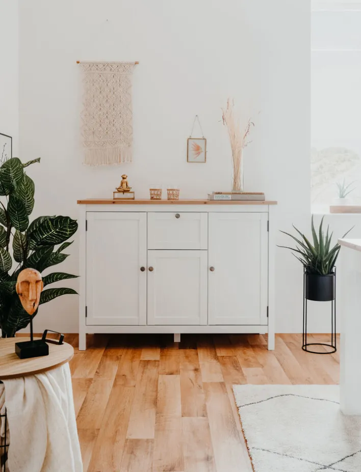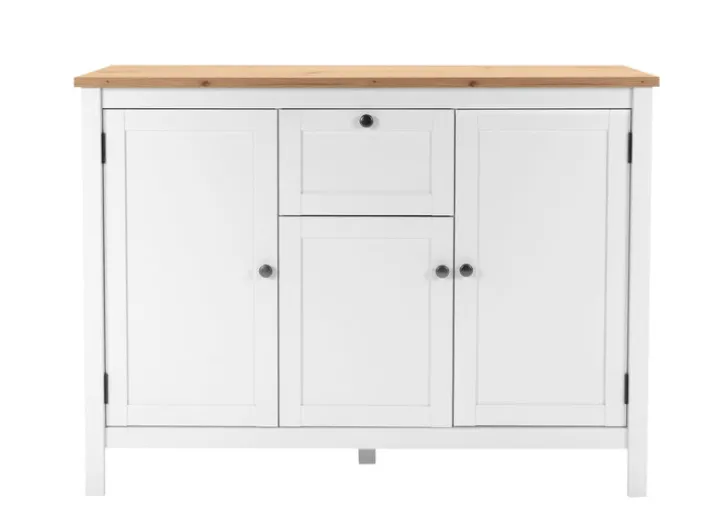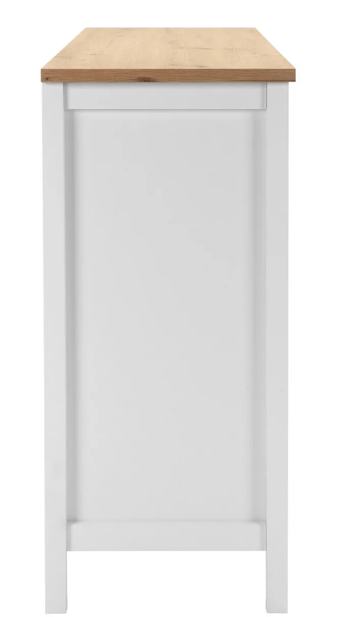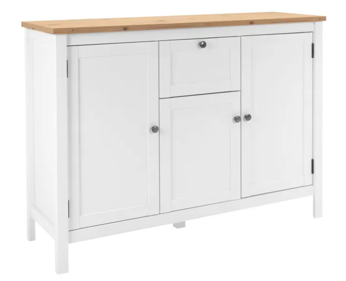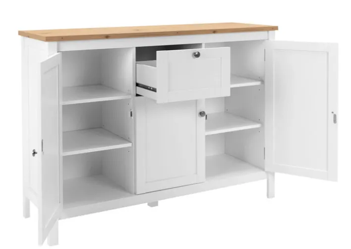 Die obere Abdeckung des Sideboards ist als Nachbildung in Artisan Eiche gestaltet. So ergibt sich zu dem großen Korpus in Weiß ein attraktiver Kontrast. Die recht hohen Füße lassen die Gesamtoptik des Möbels leicht wirken. Auch sehr schick sind die Knopfgriffe an Drehtüren und Schublade. Zudem sind Türen und Schubkasten mit einer angenehm designten Kassettenform ausgestattet. Fünf Einlegeböden werden mitgeliefert.