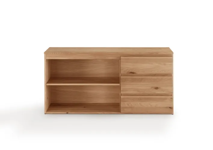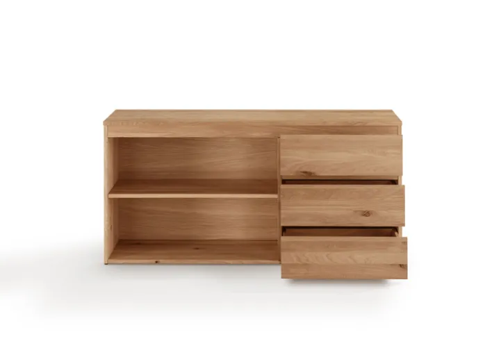 Eine hochwertige Verarbeitung zeichnet dieses Sideboard aus, das aus massivem, naturbelassenem und sorgfältig geöltem Eichenholz hergestellt ist. Das rustikale Design und die natürliche Holzmaserung mit Astlöchern setzen wohnliche und stilvolle Akzente im Büro oder Home-Office. Das Sideboard ist links mit einem Einlegeboden und auf der rechten Seite mit drei geräumigen Schubkästen ausgestattet. Hier lassen sich wichtige Dokumente, Aktenordner und andere Büroutensilien ordentlich unterbringen. Zudem kann das Sideboard mit einem passenden Anbau-Schreibtisch aus dem gleichen Möbelprogramm DURABLE OFFICE von Gradel kombiniert werden.