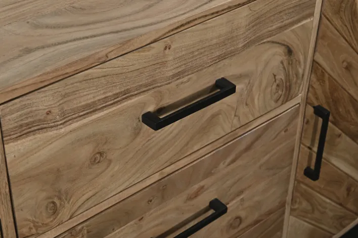 Das 160 x 80 cm große LUANDA Sideboard aus Akazie in Natur/Schwarz ist ein ebenso massives wie flexibel in den Raum integrierbares Möbelstück, das mit seiner auffälligen und für die Akazie charakteristischen Maserung an der Vorderseite sofort die Blicke auf sich zu ziehen weiß. Ebenfalls ein Highlight: Die unterschiedliche Holzverarbeitung an den Seiten gegenüber den Schubkästen in der Mitte.