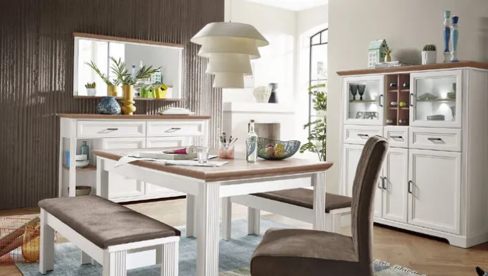Die Sitzbank aus der Serie Jasmin vereint Funktionalität und ansprechendes Design im Landhausstil. Mit einer Breite von 126 cm, einer Höhe von 48 cm und einer Tiefe von 41 cm bietet sie ausreichend Platz und Komfort. Die Sitzfläche aus Textil in einem warmen Braunton harmoniert perfekt mit der weiß folierten Oberfläche des Gestells, das durch seine dekorative Pinienoptik besticht.