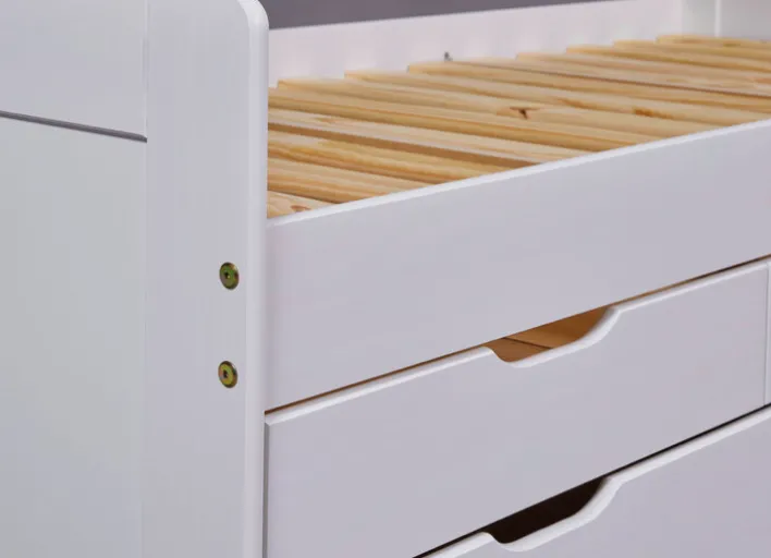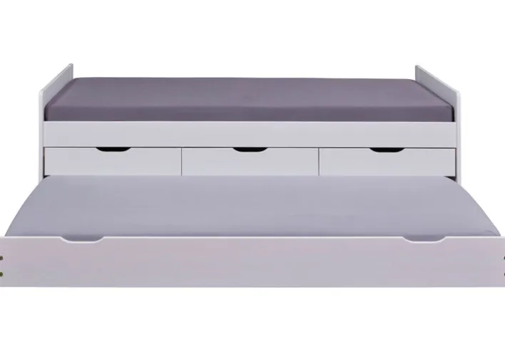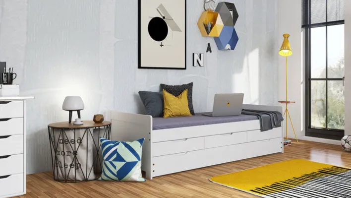 Bemerkenswert ist der bei diesem Bett sehr großzügig zur Verfügung stehende Stauraum unter dem Lattenrost. Drei Schubkästen können getrennt voneinander herausgezogen werden. Sie verwahren viele Kleinigkeiten geschützt vor Schmutz und Staub. Darüber hinaus ist in das Bett eine Gästeliege integriert. Wer sich für ein Wohnzimmer oder Schlafzimmer eine kompakte Lösung zum Schlafen wünscht, ist mit diesem All-in-one-Modell sehr gut beraten.