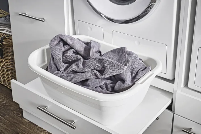 Der in weißer Farbe gehaltene Stauraumschrank MR. SAUBER glänzt durch sein schlichtes Design sowie seine Funktionalität.