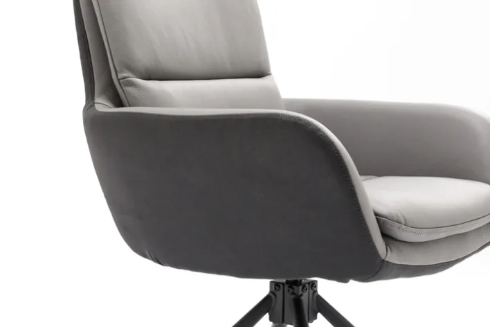 Der mit Echtleder bezogene Stuhl NOVALEE besitzt an seinen äußeren Flächen einen pflegeleichten Mikrofaser-Bezug, zudem lässt er sich ohne großen Kraftaufwand flexibel um 360 Grad drehen. Damit passt der kleine Stuhl an jeden beliebigen Tisch, zum Beispiel auch an einen Schreibtisch oder an den Esstisch. Die etwas höhergefasste Lehne sorgt für zusätzlichen Komfort.
