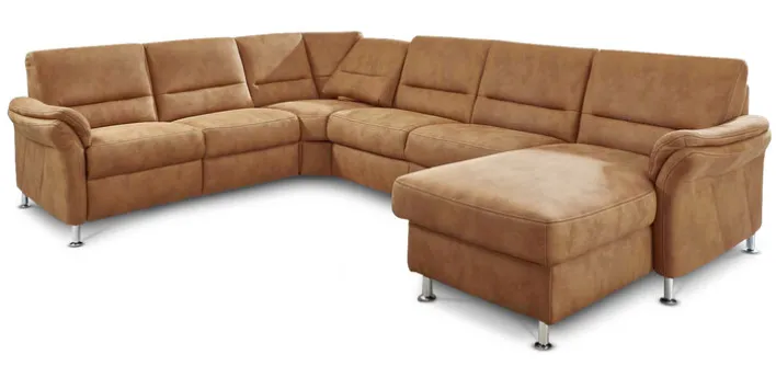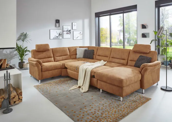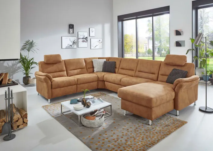 Die SYSTEMPOLSTER Wohnlandschaft ANDERLECHT-DK SF zeigt sich in Zimtbraun. Sie ist mit einer Schlaffunktion ausgestattet. Darüber hinaus sind die Rückenteile verstellbar. Die beiden Kopfstützen sind im Lieferumfang enthalten.
