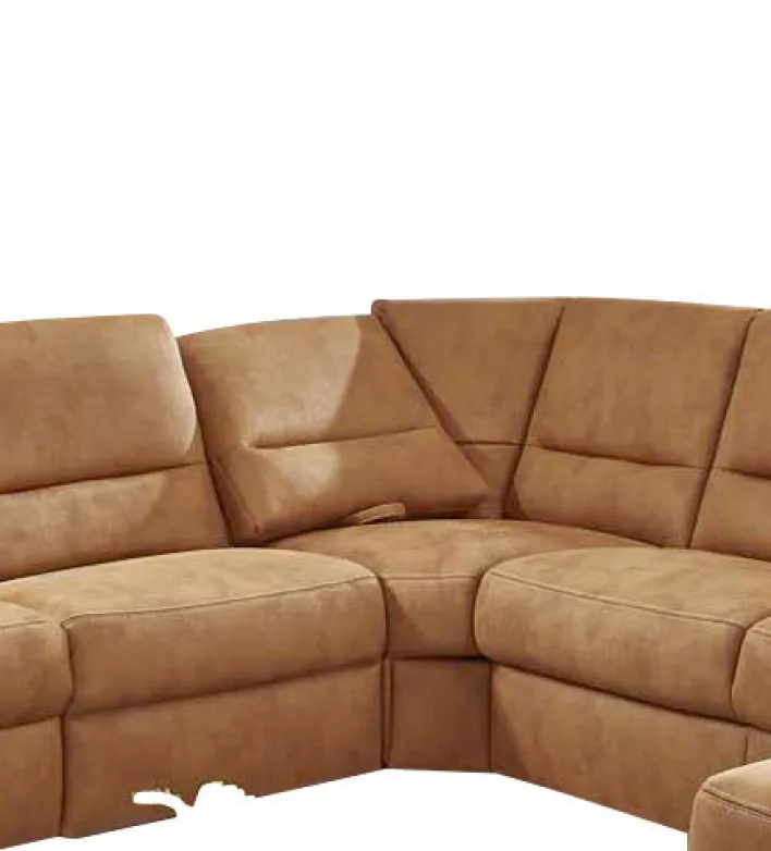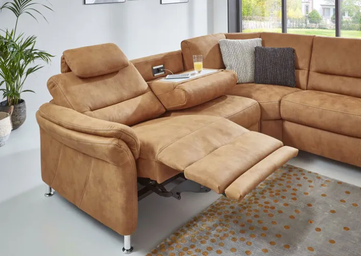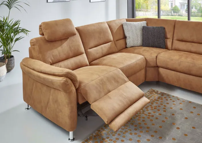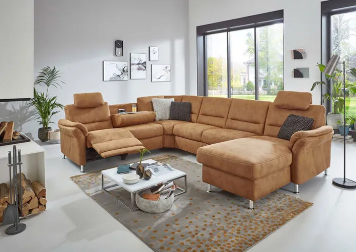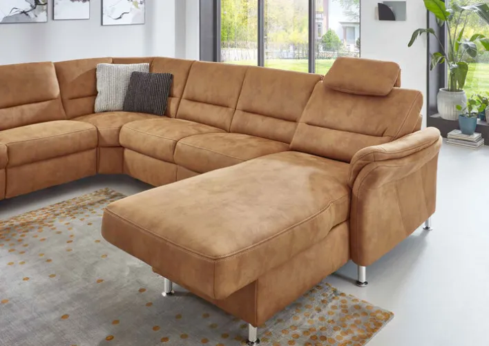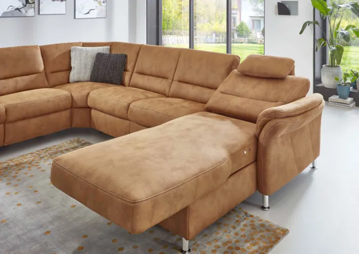Eine schicke Kontrastnaht sorgt für ein markantes Aussehen. Das Sofa besteht aus zwei 2,5-Sitzern sowie einem Kanapee. Ein verstellbares Fußteil sorgt für noch mehr Bequemlichkeit. Dies gilt auch für die Rückenteile, die sich verstellen lassen. Es bietet außerdem einem Gast Platz, falls dieser übernachten möchte. Da der Rücken echt bezogen ist, lässt sich die Wohnlandschaft auch gut mitten im Raum aufstellen. Die warme Farbe Zimtbraun passt unter anderem gut zu Holzmöbeln.